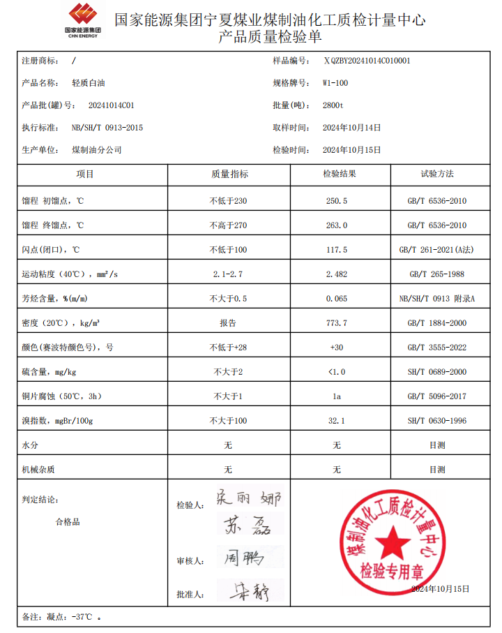 宁煤100白油2024年10月15号指标
