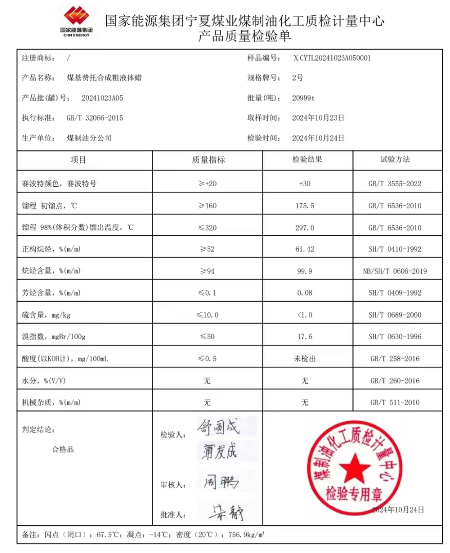 宁煤粗2液蜡2024年10月23号指标