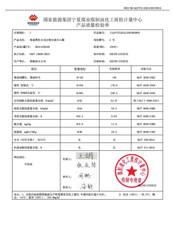 宁煤粗液体蜡2号2024年12月3日指标