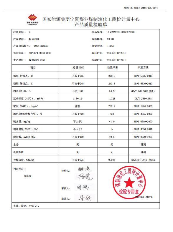 宁煤轻质白油W1-80 2024年11月27日指标