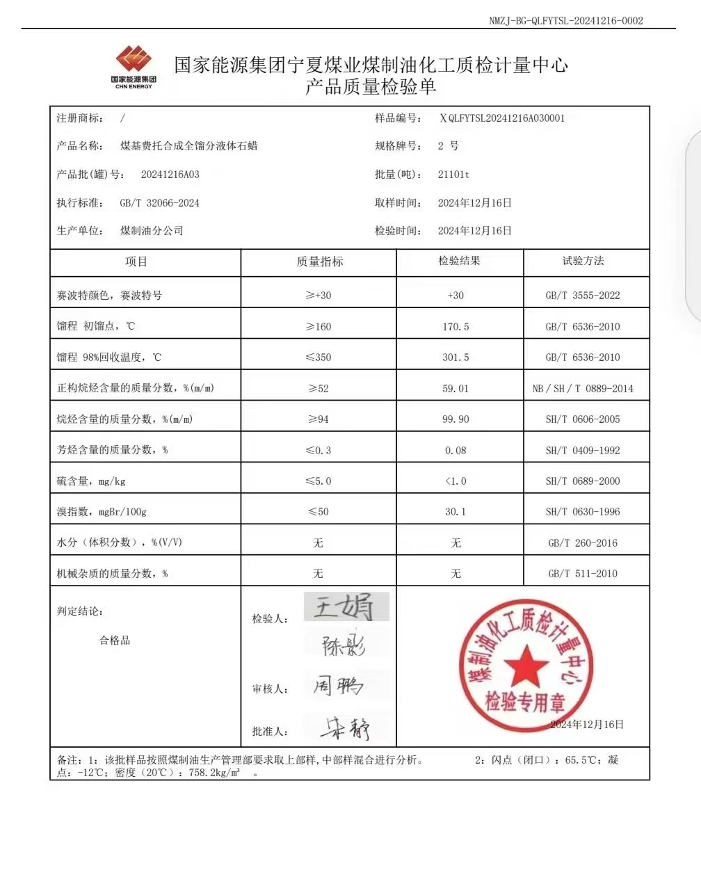 宁煤粗液体蜡2号 2024年12月16日指标