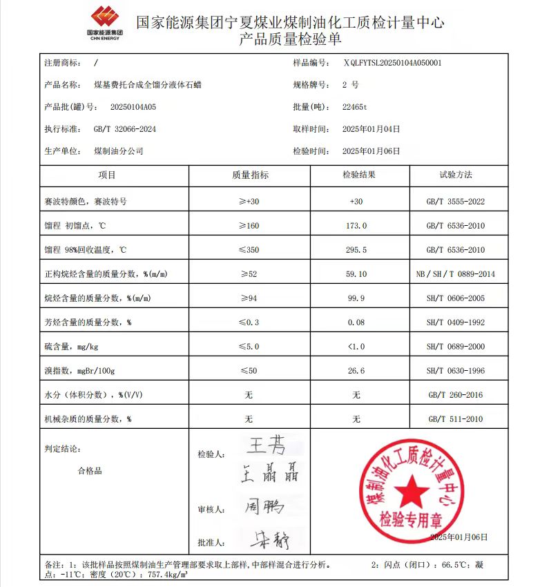宁煤粗液体蜡2号2025年1月6日指标