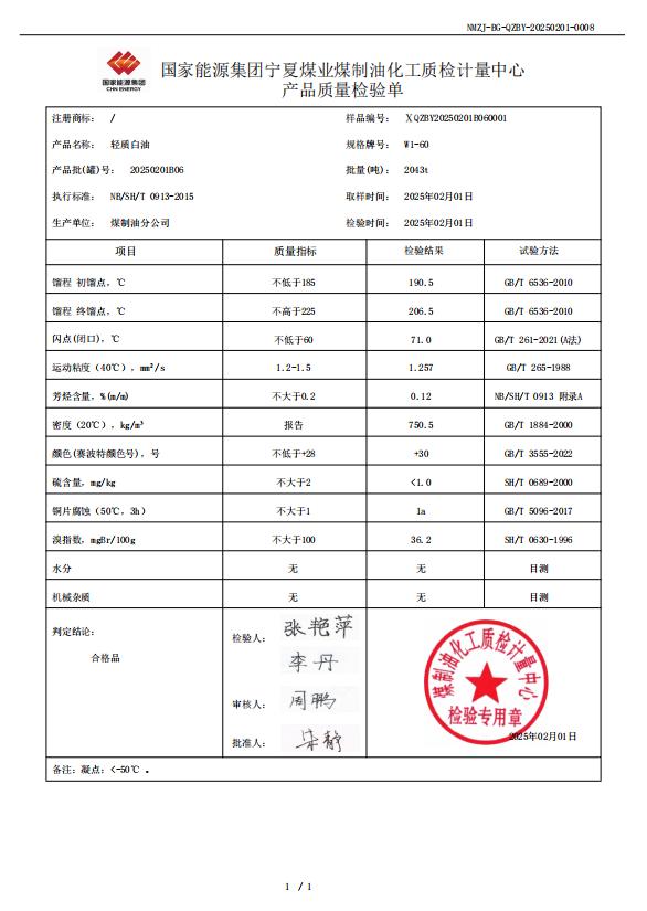 宁煤轻质白油W1-60 2025年2月1日指标