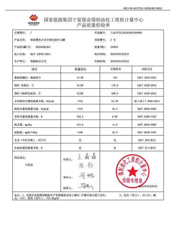宁煤粗液体蜡2号 2025年3月3日指标