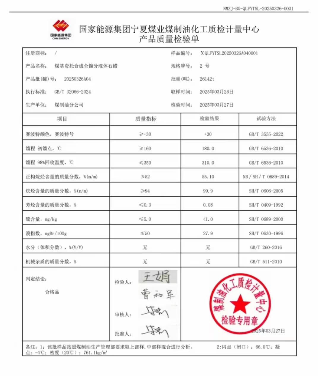 宁煤粗液体蜡2号 2025年3月27日指标