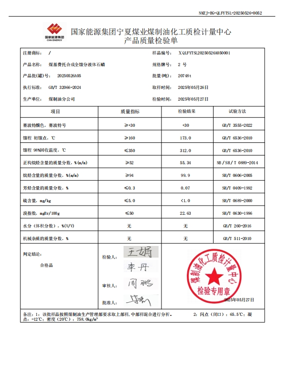 宁煤粗液体蜡2号 2025年5月26日指标