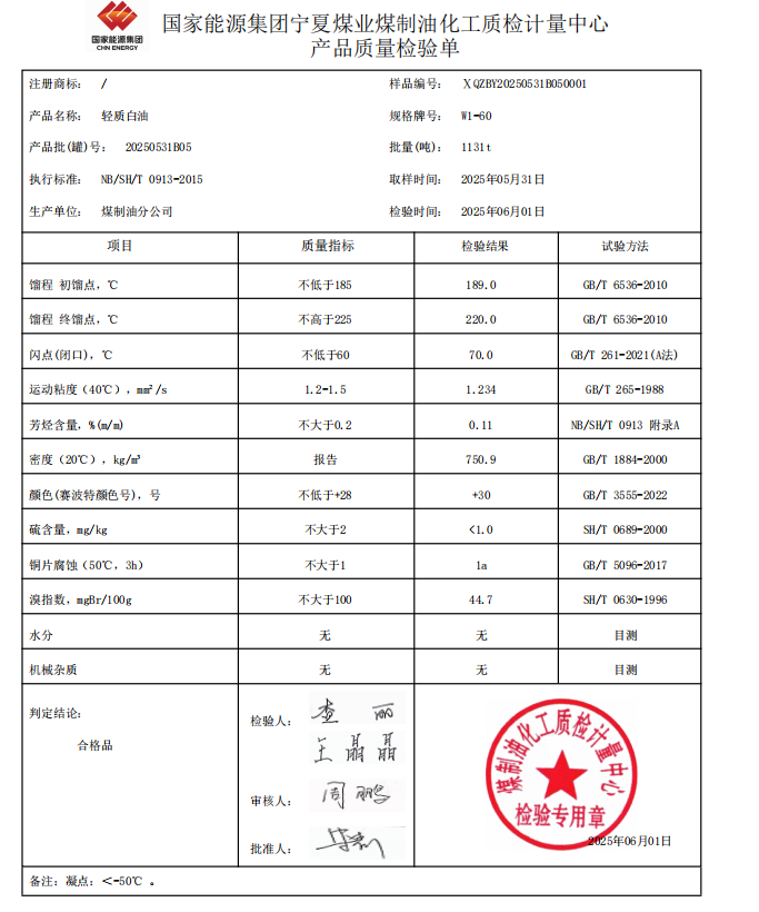 宁煤轻质白油W1—60 2025年6月1日指标