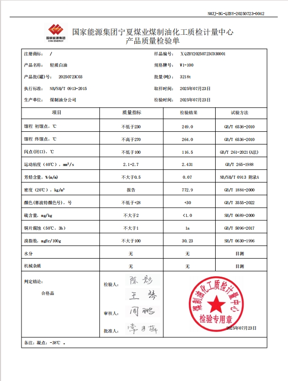 宁煤轻质白油W1—100 2025年7月23日指标