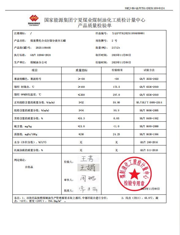 宁煤粗液体蜡2号 2025年11月9日指标