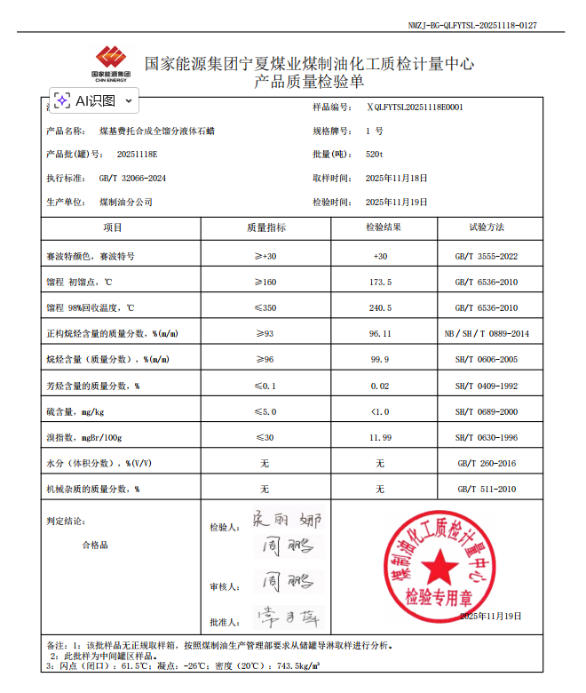 宁煤粗液体蜡1号 2025年11月19日指标