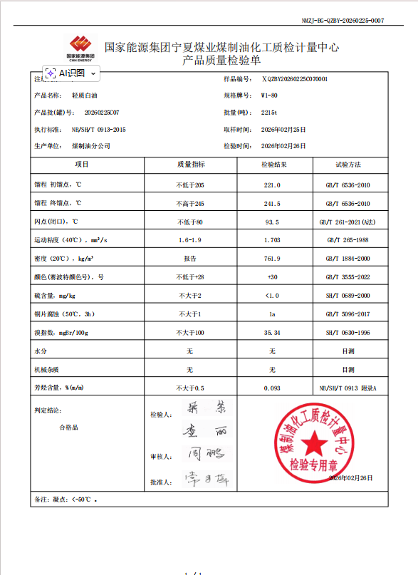 轻质白油W1—80 2026年2月25日指标