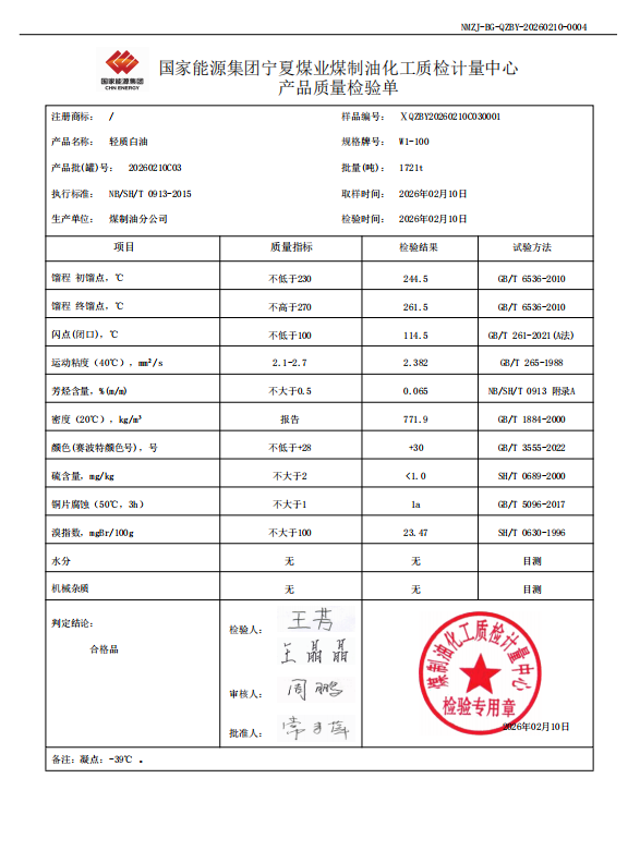 轻质白油W1—100 2026年2月10日指标