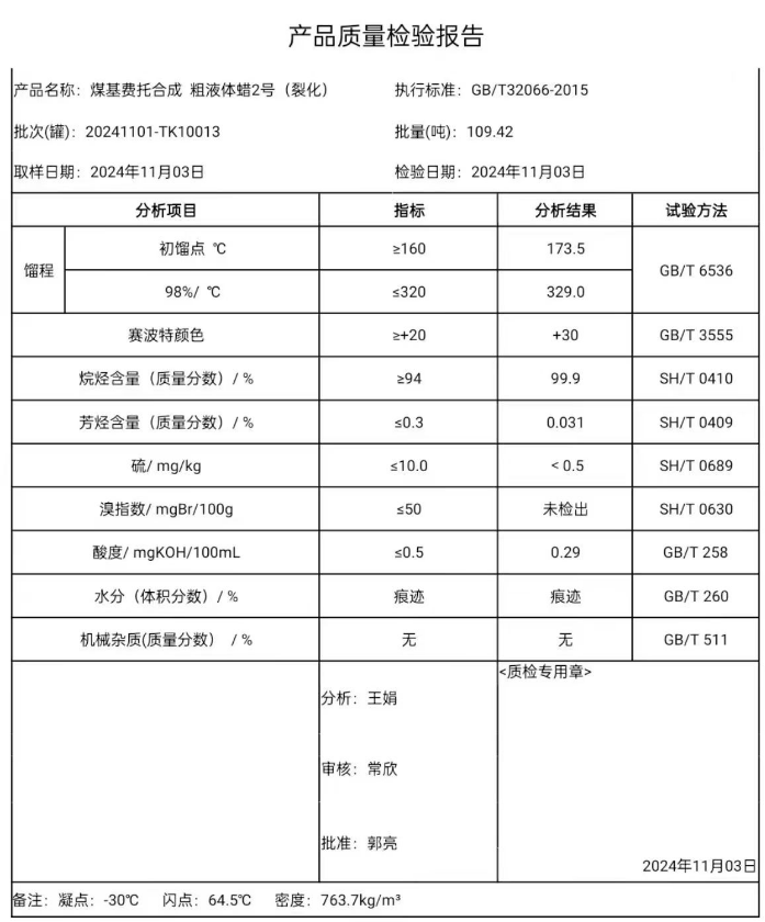 潞安裂化粗2液蜡11月3日指标
