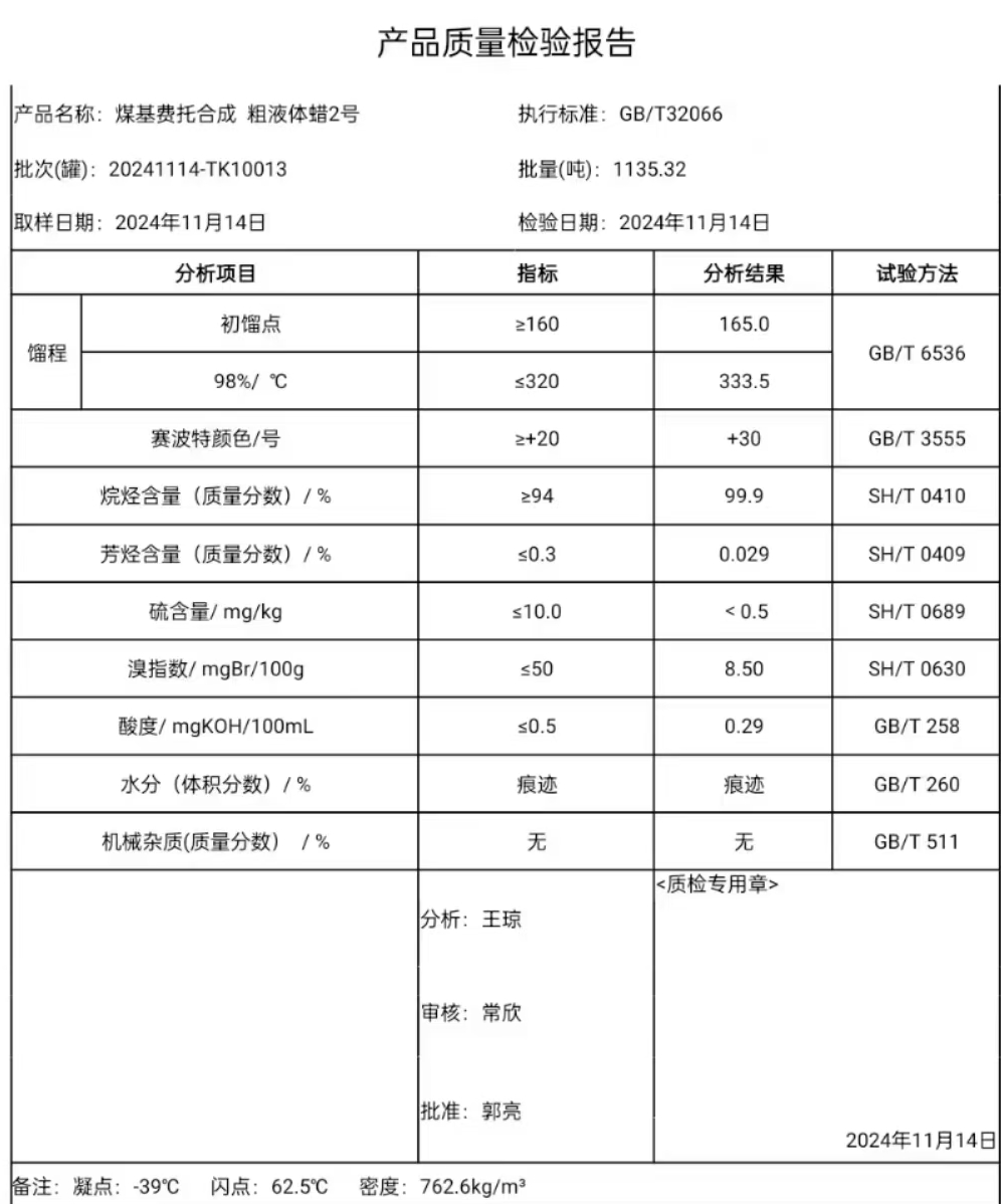潞安裂化粗2液蜡11月14日指标