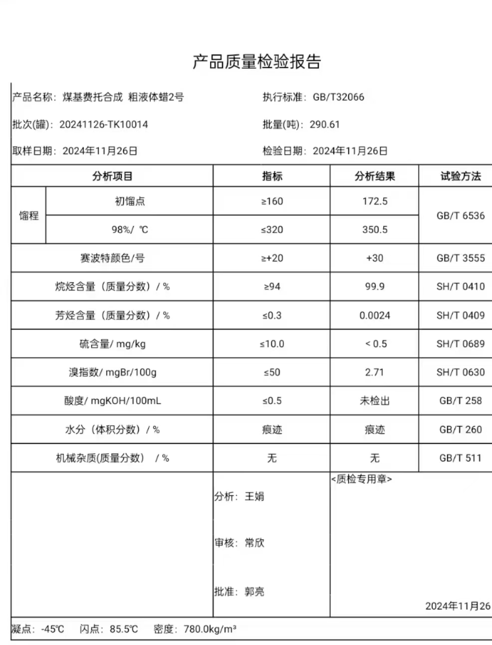 潞安粗液体蜡2号(重蜡)2024年11月26日指标