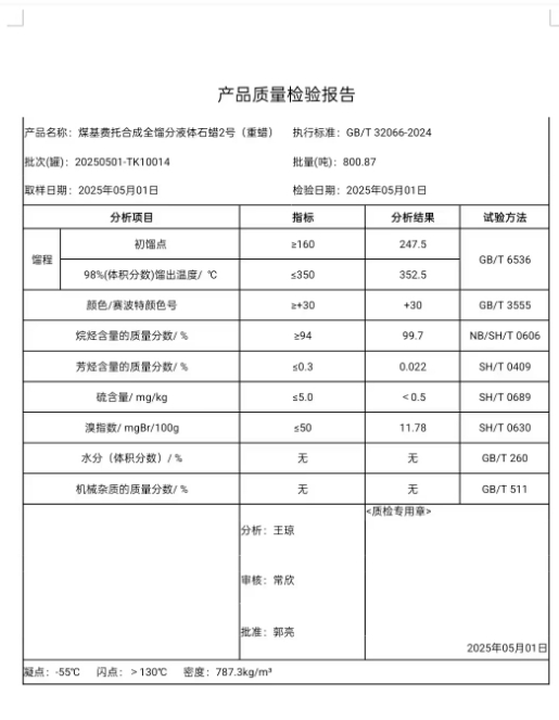 潞安粗液体蜡2号(重蜡)2025年5月1日指标