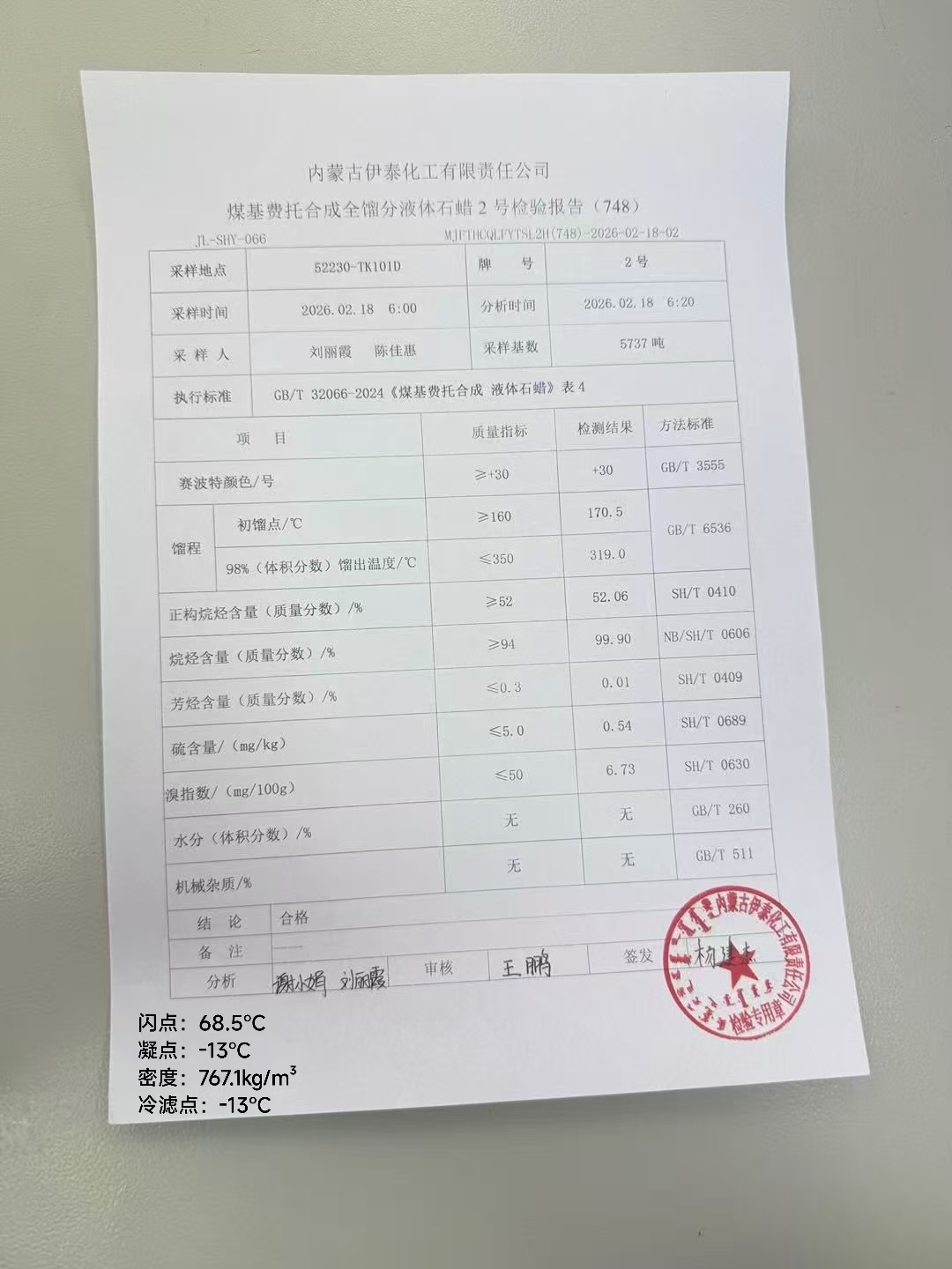 伊泰粗液体蜡2号 2026年2月18日指标