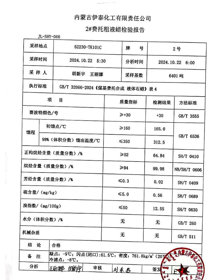 伊泰粗2液蜡2024年10月22日指标