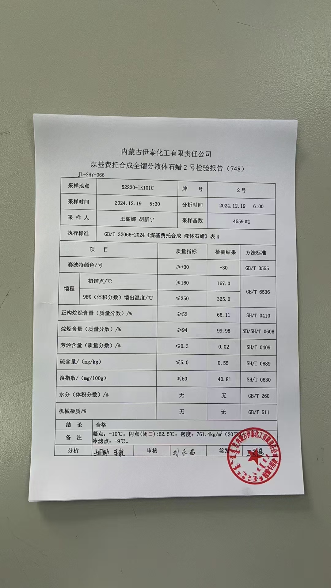 伊泰粗2液蜡2024年12月19日指标