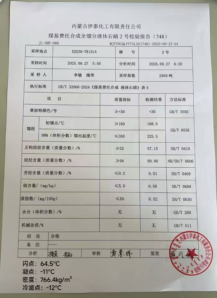 伊泰粗液体蜡2号 2025年9月27日指标