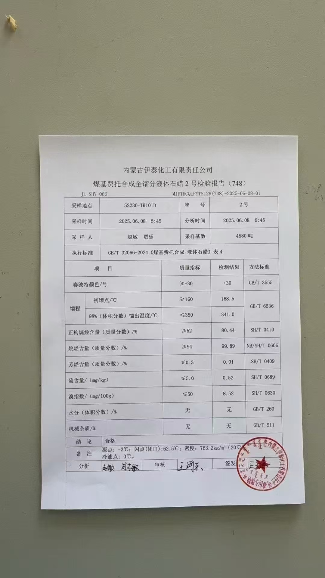 伊泰粗液体蜡2号 2025年6月8日指标