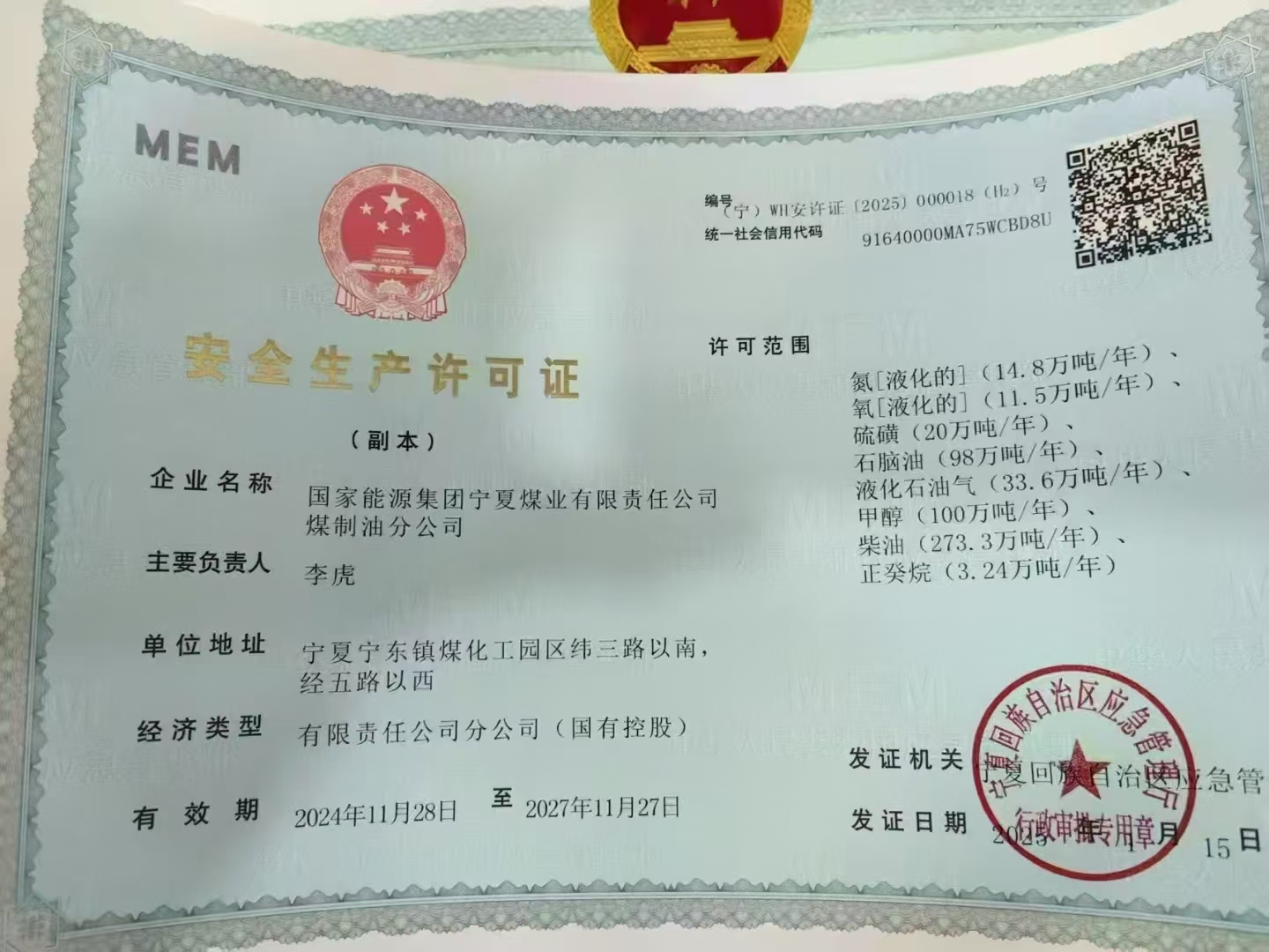 国能集团宁夏煤业有限公司煤制油分公司—安全生产许可证